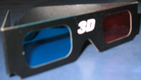 (Да, вам конечно же понадобятся 3D-очки. Я не сильно в них разбираюсь, но те, что у малого есть, — подошли. Левый «глаз» — красный, правый — синий. См. фотку выше.)